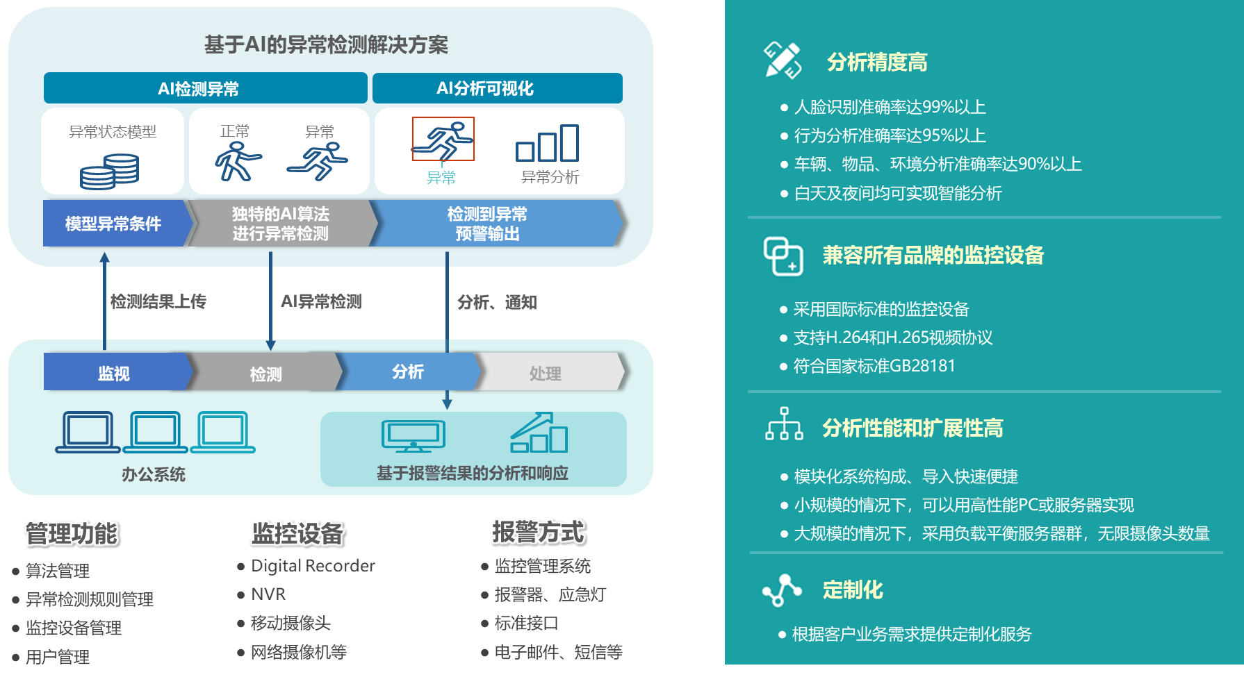 智能視頻監(jiān)控管理平臺(tái),可靈活對(duì)接客戶現(xiàn)有的各類視頻監(jiān)控系統(tǒng),利用AI視頻圖像分析技術(shù)、實(shí)現(xiàn)全天候無(wú)人化智能實(shí)時(shí)監(jiān)控預(yù)警。