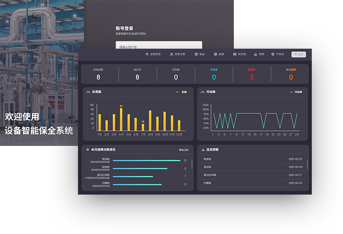 定制化數(shù)字大屏,關(guān)鍵信息(設(shè)備狀態(tài)、點檢任務(wù)、故障情況)直觀展現(xiàn),提升管理效率。